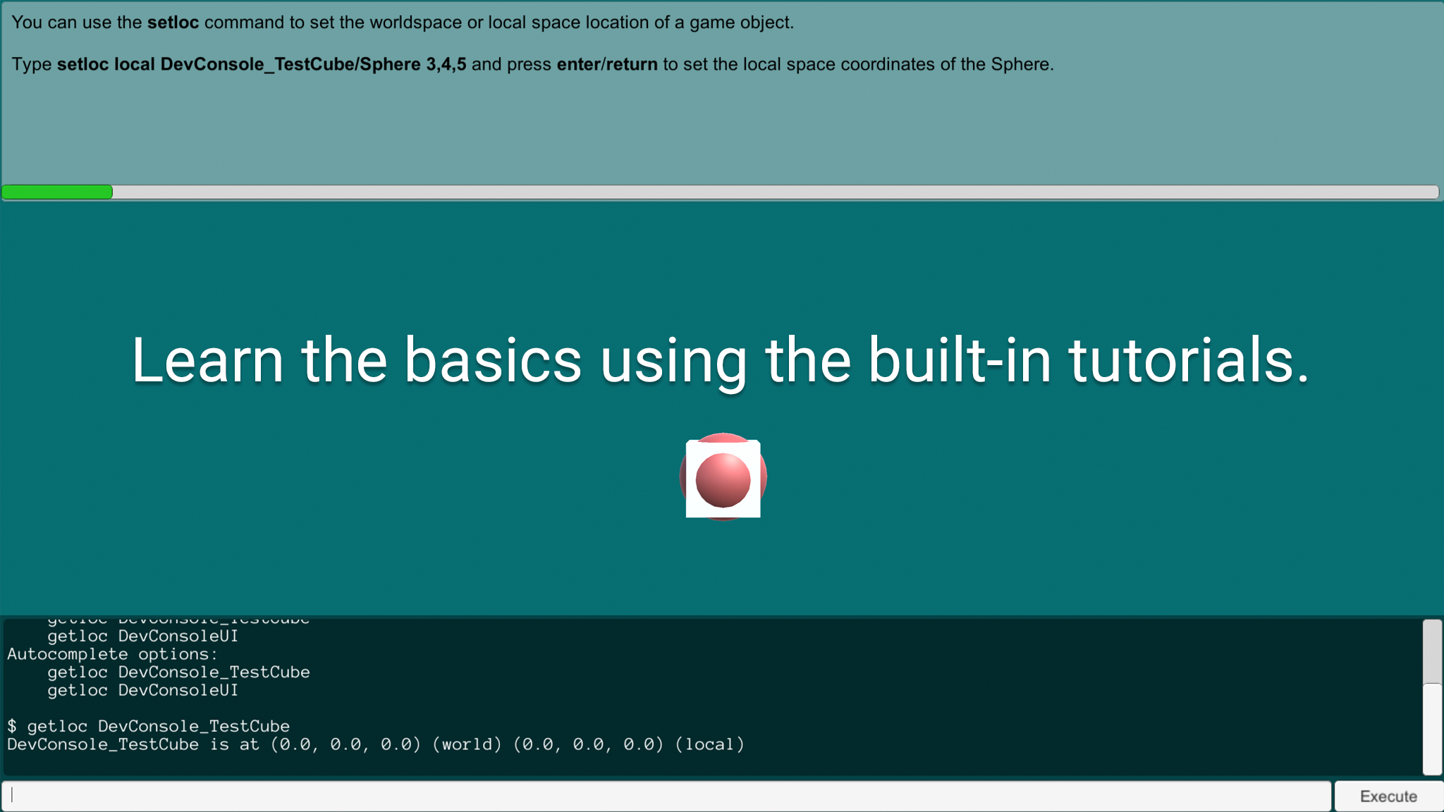 The Developer Console Add-on is a free add-on for Unity. The console provides over 20 built in commands which allow you to interact with objects, switch scenes or change elements of those scenes.
