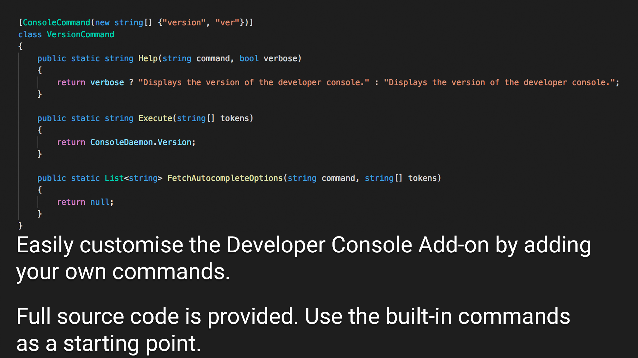 New commands can easily be added and the Developer Console Add-on includes help on creating your own commands. The full source code for all of the commands and the Developer Console itself are both included.